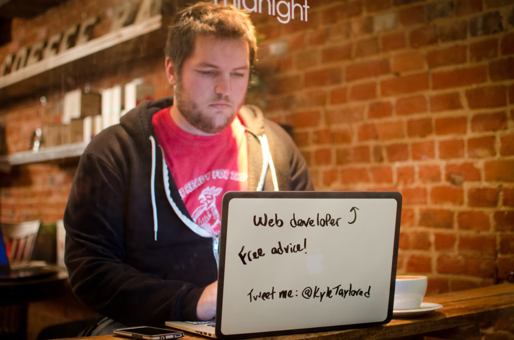 Kyle had a small business during college cutting vinyl stickers for bands, paintball groups, skateboards, and the like, but put his equipment in storage when he became a web developer. In November 2014 he had the idea to bring his gear back out and cut a giant sticker—one that would cover his laptop lid and create an instant whiteboard. Since he often works out of co-working spaces and coffee shops, it became the perfect way to engage the community and hold truly open office hours without being that creepy guy who’s wondering what you’re working on.