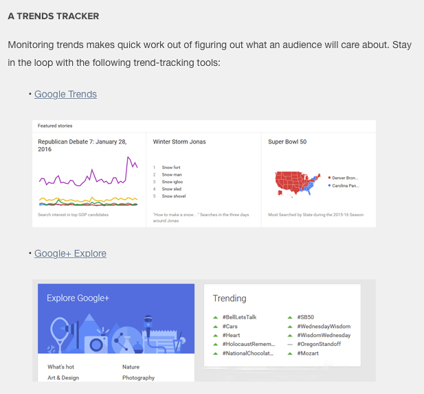 A great suggestion from Website Magazine is to track trends, using tools like Google Trends and Google+ Explore. As the number one search engine in the world, Google is used by millions of consumers every day, and the company uses its powerful analytics capabilities to track the most popular searches.