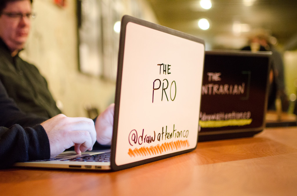 Kyle had a small business during college cutting vinyl stickers for bands, paintball groups, skateboards, and the like, but put his equipment in storage when he became a web developer. In November 2014 he had the idea to bring his gear back out and cut a giant sticker—one that would cover his laptop lid and create an instant whiteboard. Since he often works out of co-working spaces and coffee shops, it became the perfect way to engage the community and hold truly open office hours without being that creepy guy who’s wondering what you’re working on.