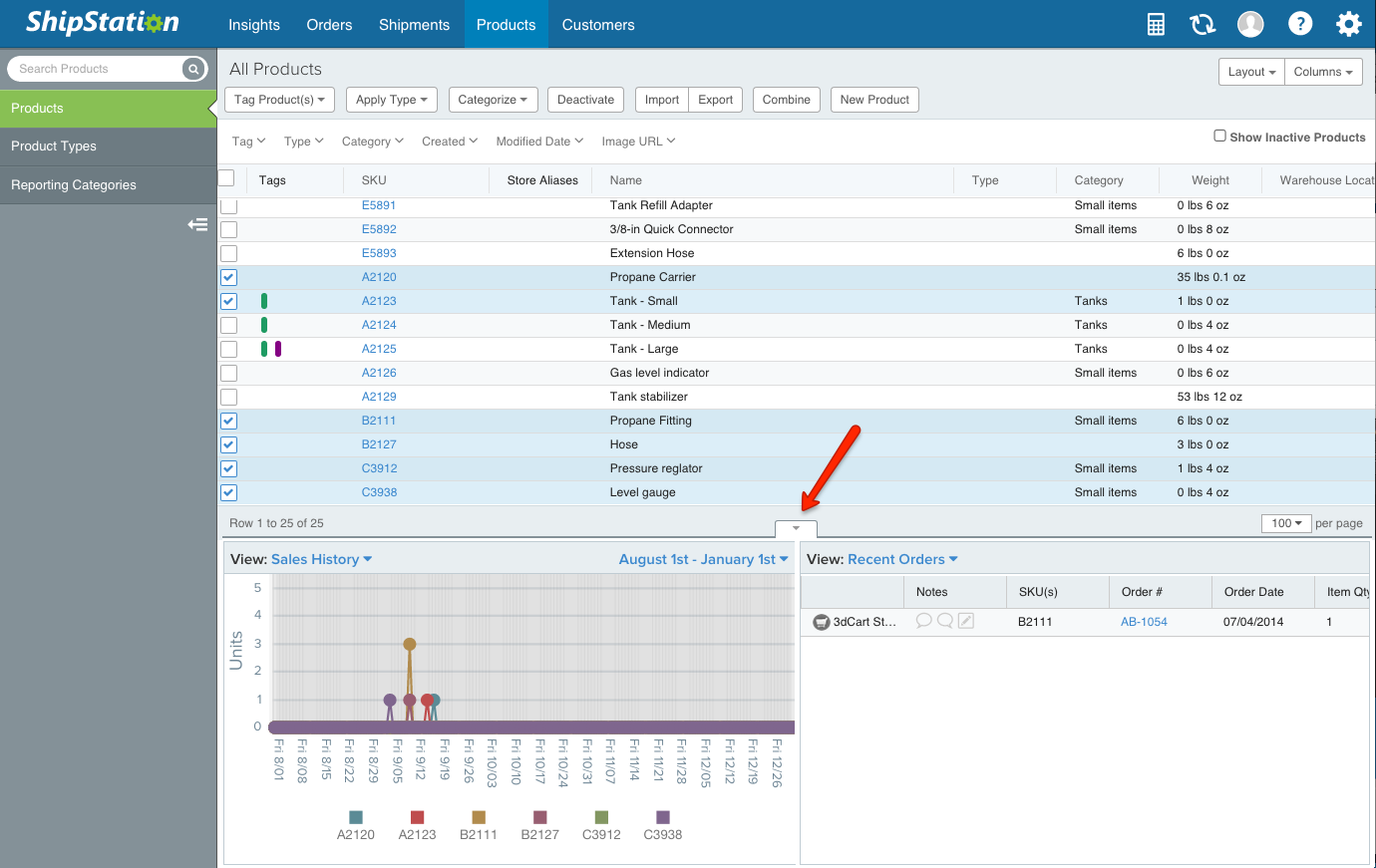 Where the Orders tab had 3 options for the 2 panes, the Products tab has 2 for 2: Recent Orders and Sales History. Recent Orders will list orders that contain the selected products (with columns and rows, a bit like a condensed version of the Orders tab). You can open up specific orders by clicking on the order number itself, bringing you to the Order Details pop-up you know and love so well.