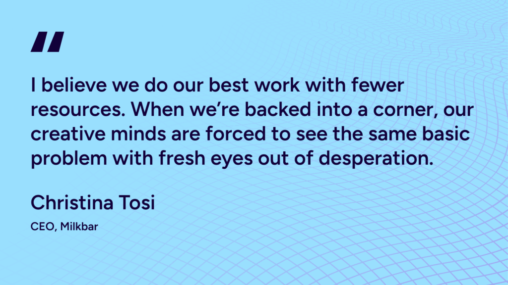 “I believe we do our best work with fewer resources. When we’re backed into a corner, our creative minds are forced to see the same basic problem with fresh eyes out of desperation.” – Christina Tosi, CEO, Milk Bar