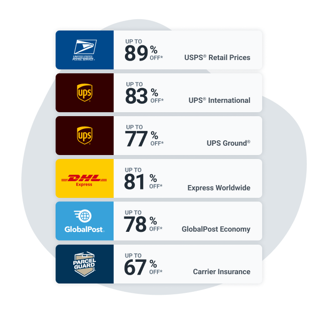 Access shipping discounts of up to 84% off* retail rates from top carriers like UPS, USPS, and DHL Express.